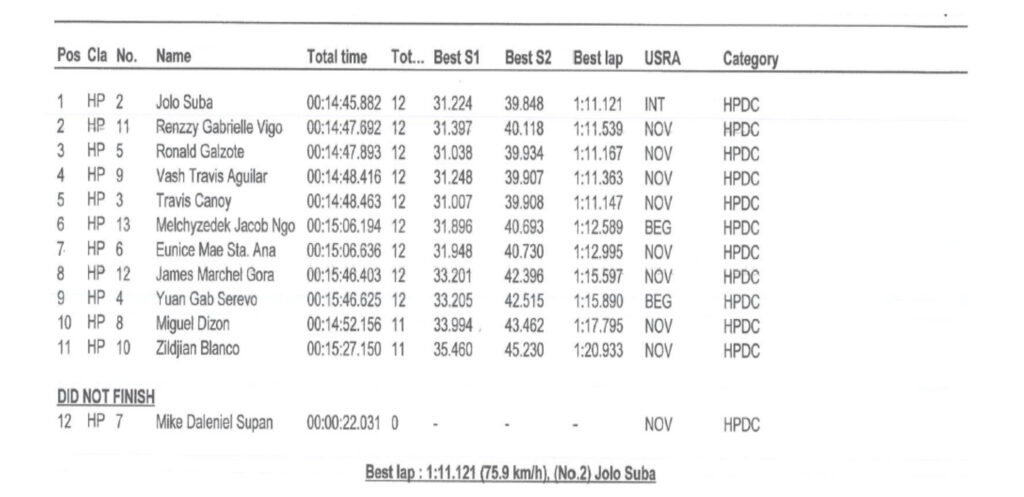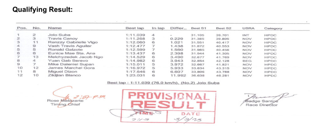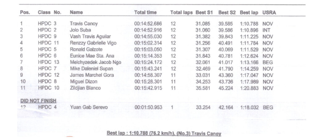 In a fierce qualifying session, Jolo Suba (#2) set the pace, engaging in a tight battle with Travis Canoy, Jr. (#3) for the lead position. Hot on their trail was Nunoy “Kidlat” Vigo (#11), showcasing his raw potential and determination to fight for a strong grid position.