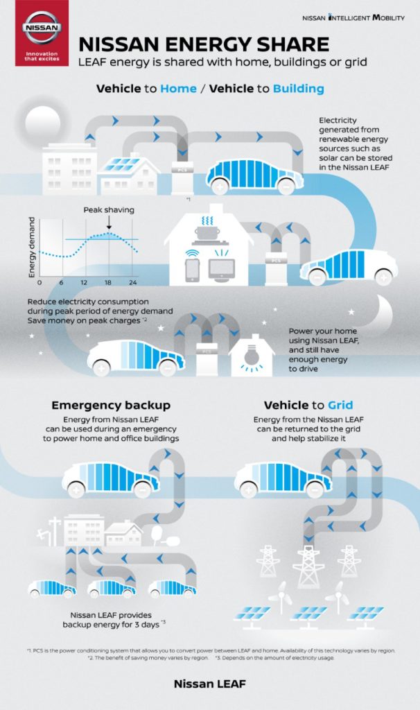 * Vehicle-to-home (V2H): Nissan is working with partners to bring inexpensive equipment to the market to popularize V2H. Using V2H, owners of Nissan electric vehicles can use their cars as a power source for the household to save money on electricity bills, or as backup power during blackouts or emergencies. This allows the usage of renewable energy when available, or when electricity is cheaper.