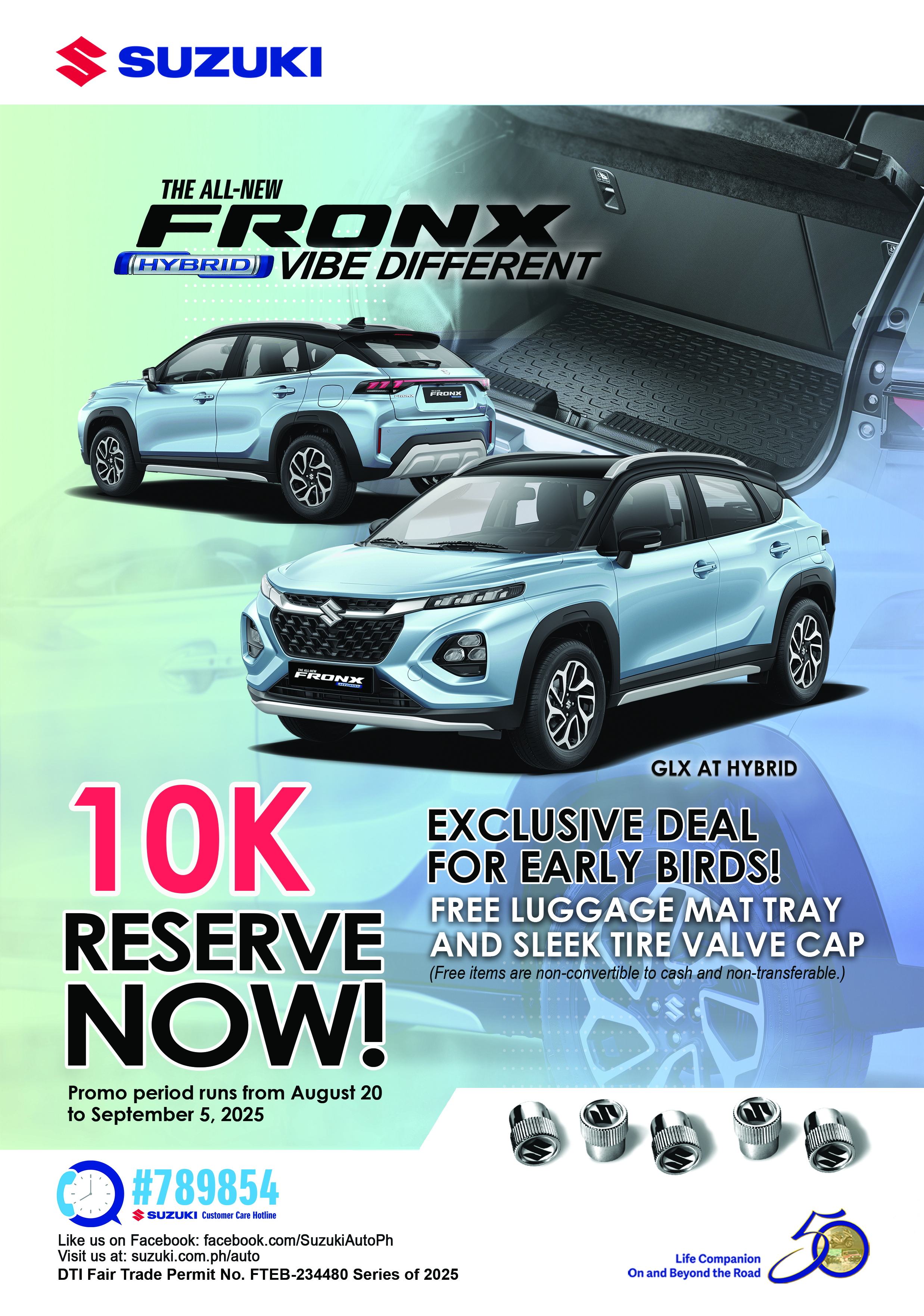 Suzuki Philippines is giving motorists the chance to get ahead of the curve with the much-anticipated arrival of the All-New Suzuki Fronx. From August 20 to September 5, 2025, customers can take advantage of Suzuki’s exclusive Early Reservation Promo and secure priority allocation for this bold and stylish crossover. By reserving the GLX AT variant during the promo period, early buyers will also enjoy exclusive freebies, including a Suzuki Genuine Accessory Luggage Mat Tray and a set of Suzuki Tire Valve Caps, adding both functionality and flair to their new ride.