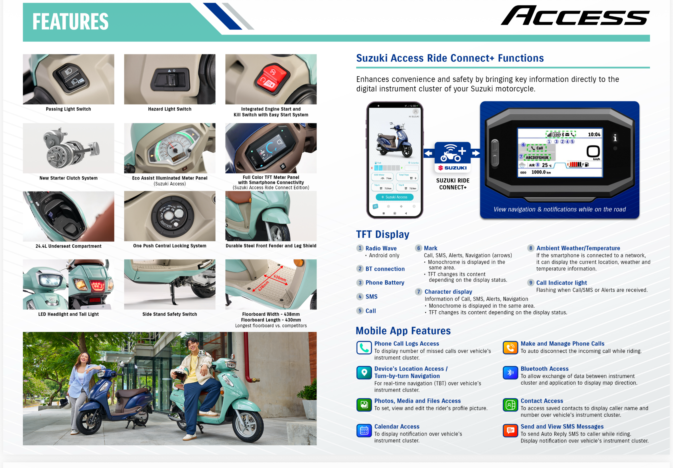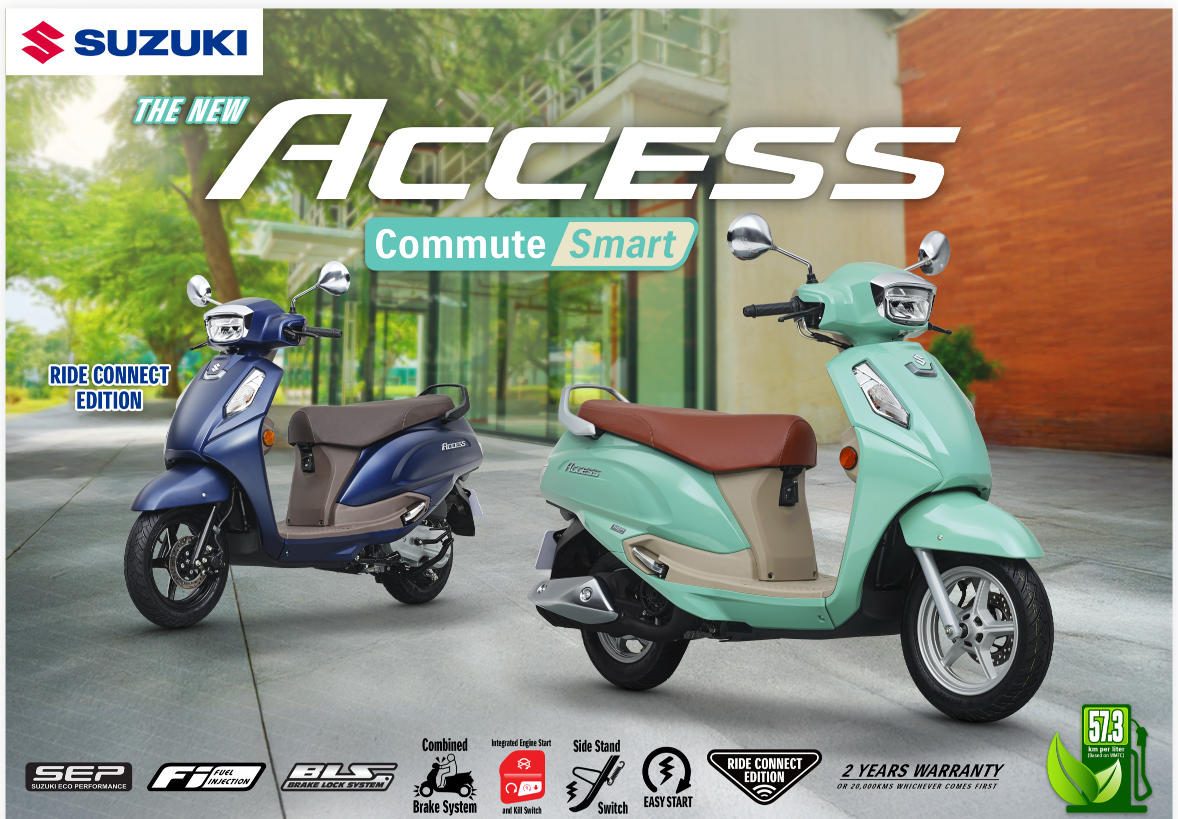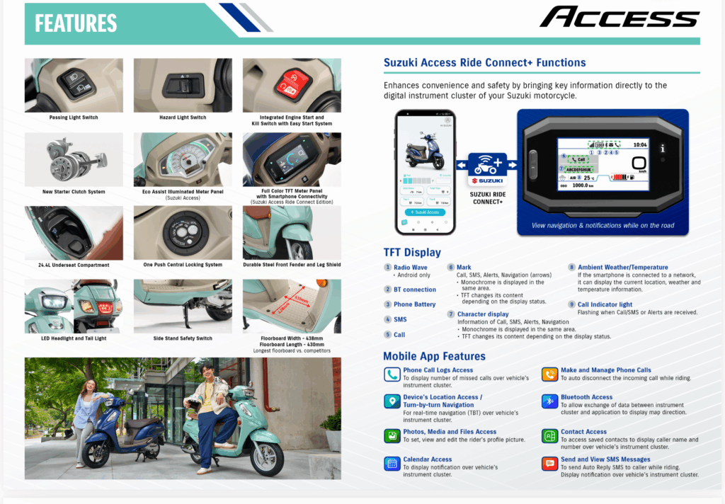 Built for smart commuters, the New Suzuki Access series integrates technology with functionality. The Access Ride Connect Editionintroduces a full-color TFT instrument panel with Bluetooth® connectivity, allowing riders to pair their smartphones via the Suzuki Ride Connect+ app for navigation, notifications, and trip data. Meanwhile, the standard Access variant offers a combined analog-digital meter with ECO Drive illumination, oil change reminders, and voltage indicators to help riders maintain optimal fuel efficiency. Both variants feature advanced safety elements, including a Combined Brake System with Rear Brake Lock, disc front brakes, LED lighting, side stand interlock, and a hazard switch.