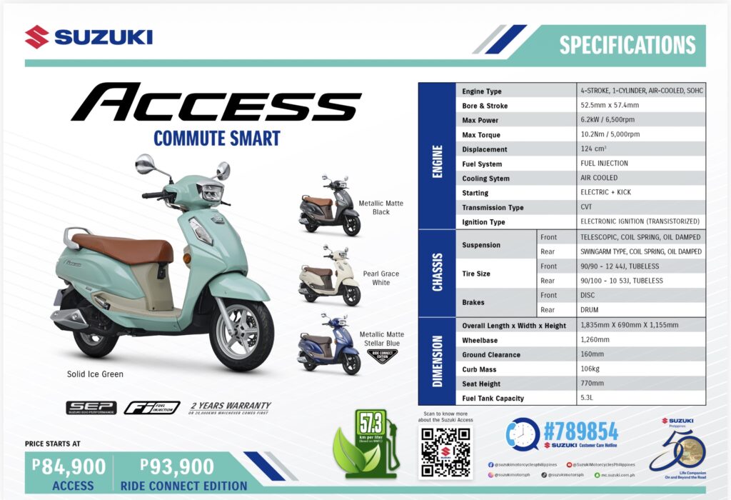 With its combination of durability, elegance, and rider-focused innovation, the The All-New Suzuki Access stands as a testament to Suzuki’s dedication to enhancing urban mobility. Available in Solid Ice Green, Pearl Grace White, and Metallic Matte Black, the standard Access is priced at ₱84,900, while the Ride Connect Edition, finished in Metallic Matte Blue, retails at ₱93,900. Both are now available at Suzuki dealerships nationwide.